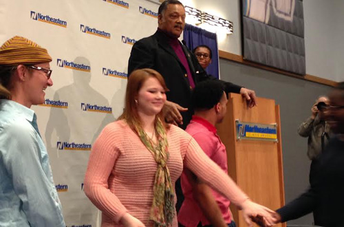 Photo: Students join the Rev Jesse Jackson at Northeastern Illinois University Jan 25 pledging to register to vote and demand a state budget that funds education. | Teresa Albano/PW