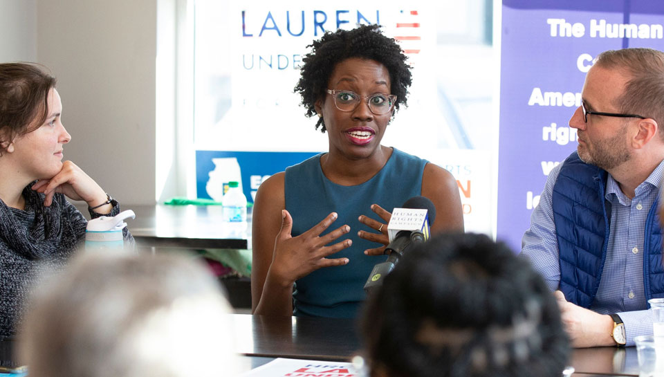 “As a career public servant at HHS, Lauren helped implement the Affordable Care Act — broadening access for those on Medicare, improving healthcare quality and reforming private insurance,” her bio adds. “During a swimming lesson when she was 8 years old, Lauren discovered she had a heart condition, supraventricular tachycardia, which occasionally prevents her heart from maintaining a normal rhythm. The providers that helped Lauren through her initial treatment made a lasting impression and inspired her career in nursing. As an American with a pre-existing condition, Lauren understands the real-life importance of quality, affordable health care for working families and their children.”