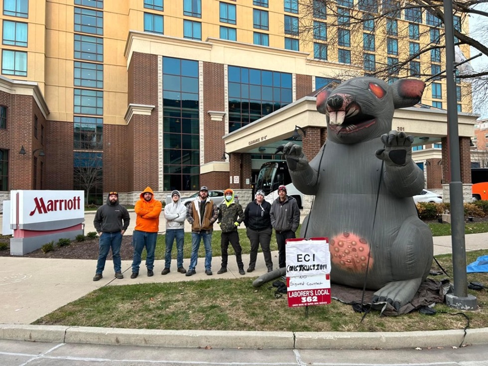 BLOOMINGTON-NORMAL, Ill.—Laborers Local 362 (LiUNA) began picketing the Uptown Marriott Hotel here on Nov. 13 as a force of non-union renovation contractors started their work day. The Laborers were there with Scabby the Rat, an infamous inflatable fit for those who cross organized labor.