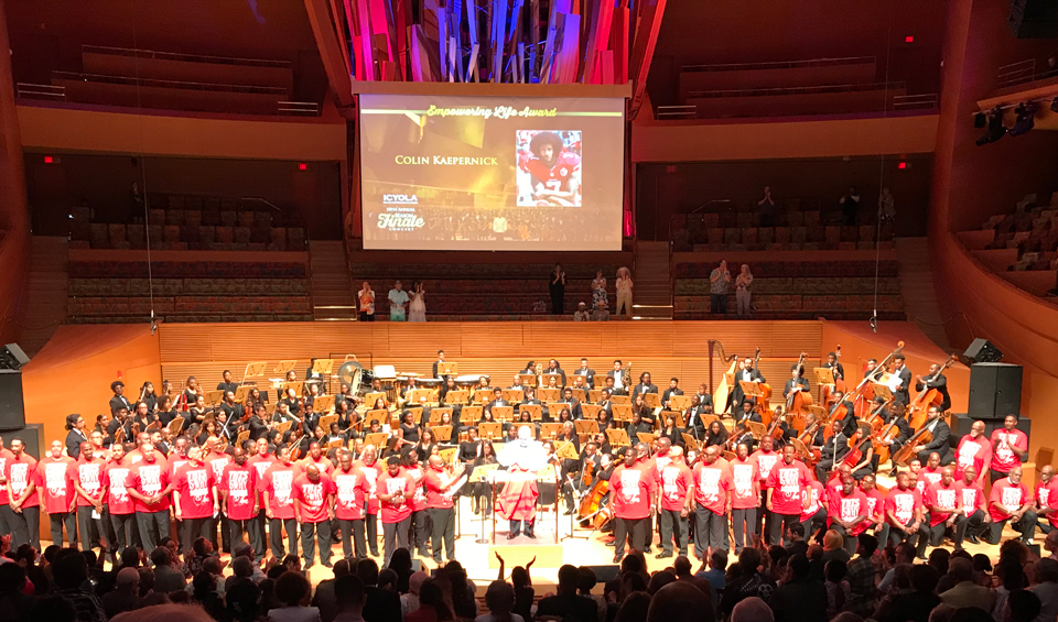 Concluding the first half, Dickerson presented the world premiere of his 12-minute cantata with full orchestra, This Is Why We Kneel. In conjunction with the performance, the orchestra gave its Empowering Life award to football player Colin Kaepernick, who initiated the movement to “take a knee” during the playing of the national anthem before NFL games as a peaceful, nonviolent way of calling attention to the continuing issues of racial injustice and excessive police violence in America that contrast so tragically with the “land of the free, home of the brave” spirit that the anthem describes for America. Kaepernick was not able to be present for this occasion, but a video about him featuring him in a recent speech (and with an elegant new hair design!) was screened. Dickerson amplified the message against police violence to also add, “And don’t be killing each other!” which received vocal support from the audience.