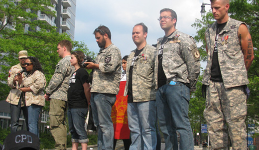 In a particularly moving moment, IVAW organizer and Illinois Guardsmen Aaron Hughes dedicated his three medals to “Anthony Wagner, who died last year” and to “one-third of the women in the military who are sexually assaulted by their peers; we talk about standing up for our sisters in Afghanistan and we can’t even take care of our sisters here,” he said.