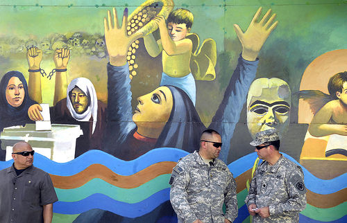 Photo: U.S. soldiers and a private security guard are dwarfed by a Baghdad mural depicting Iraqi striving for freedom and a better life.(http://www.flickr.com/photos/soldiersmediacenter/ / CC BY 2.0)