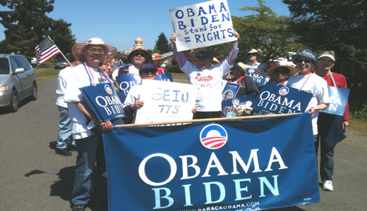 SEQUIM, WA—Members of Clallam County for Obama marched in the 117th Irrigation Festival parade, May 12, carrying their banner and chanting “Four More Years” as crowds along the route applauded and gave the thumbs-up salute.