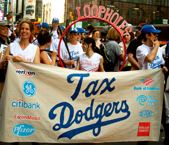Photo: Tax Day, April 17, 2012, including the Tax Dodgers and Corporate Loophole cheerleaders, in New York’s Garment District. “You pay taxes so we don’t have to. We’re the Tax Dodgers. We’re number 1. And by that we mean we’re the 1 percent.” Bee Collins CC 2.0