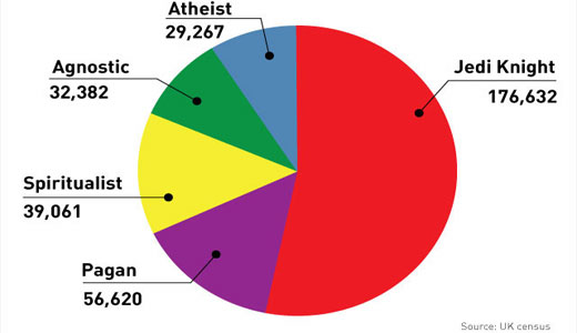 Popular sci-fi and fantasy have certainly become an important part of world culture over the years: Star Trek fans actually learn and speak the Klingon language, while Harry Potter fans saw the word “muggle” officially enter the Oxford English Dictionary in 2003. But it seems that the full extent of popular fiction’s influence has been underestimated: ‘Jedi’ is now the most popular faith in the ‘Other Religions’ category in England and Wales. The Star Wars creed now takes seventh place among all major world religions. And right behind adherents to “the Force” are Pagans and “spiritualists.”