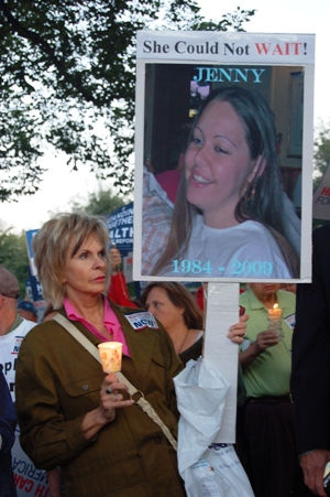 Carrying a poster-sized photo of Fritts at the vigil with the words “She Could Not Wait,” were her in-laws Midge and Dan Hough. Dan told the story of Fritts’ tragic death and the impact on their family to the several hundred people gathered at Grant Park and holding lit candles. “She leaves a 2-year-old child and a devastated husband. And I just think that a for profit hospital” and no health insurance was as much a cause of her death as the infection, he said quietly. “We can’t have any more Jennys.”
