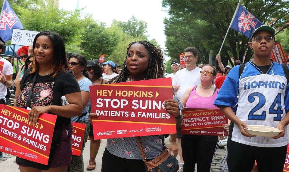 Led by National Nurses United and AFL-CIO President Richard Trumka and Secretary-Treasurer Liz Shuler, the crowd demanded Hopkins stop waging all-out union-busting against NNU. Hopkins nurses want their union “so they can advocate for their patients,” NNU Executive Director Bonnie Castillo, an RN from California, said. NNU members from New York, Philadelphia, and D.C. also showed up in solidarity.