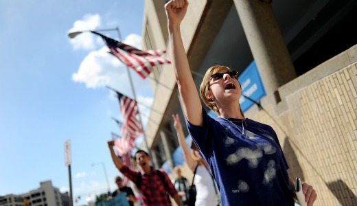 Photo: UAB student Meagan Griffin, right, and others march during a student immigration rally protesting the HB 56 near campus in Birmingham, Ala., September 28. (AP Photo/The Birmingham News, Tamika Moore)
