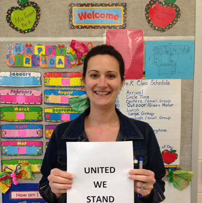 Photo: A teacher with the United Teachers of New Orleans holds a sign reading “United We Stand” in solidarity with the fired New Orleans teachers. | United Teachers Facebook page