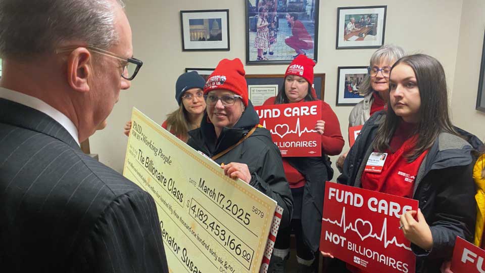Some supporters of the nurses also spoke, including Dr. Julie Pease, longtime president of Maine AllCare, the Maine affiliate of Physicians for a National Health Program. The nurses then led the crowd in a march to Sen. Collins’ office. They requested the senator’s surprised and grumpy staff to deliver their four-foot-long fake check to her.