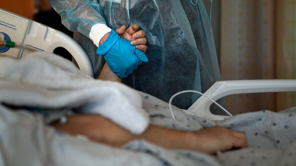 El capellán sostiene la mano de un paciente de COVID-19 fallecido mientras habla por teléfono con un familiar del paciente en el Providence Holy Cross Medical Center, Los Ángeles. Foto AP / Jae C. Hong