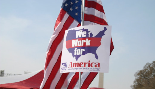 Photo: An SEIU sign held aloft at Sunday’s March for America. http://www.flickr.com/photos/luckywhitegirl/ / CC BY 2.0