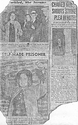 A front-page photograph in the Oct. 26, 1936, edition of the Daily News captured the defiant, young face of Jessie Taft as she stood chained to the balcony of a New York City hotel. With her fists raised high, still encased in chains, Taft demanded that the hotel stop sending its linen to the Sutton Superior Laundry where workers were on strike against abusive conditions and substandard wages.
