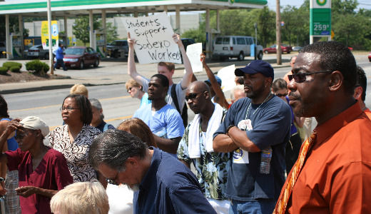 Photo: Workers rally at Sodexo laundry in Cleveland, July 8. (Debbie Kline)