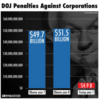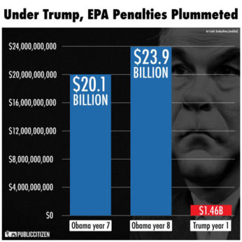 The report found that in 11 of the 12 federal agencies led by a Trump-appointed official during the president’s first year, penalties imposed on corporate violators dropped, in the majority of cases by more than 50 percent.