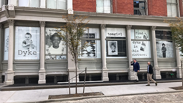 AND SO ARE YOU, the third exhibition, faces out from the museum windows around the corner onto both Wooster and Grand Streets. Large panels created by an anonymous art collective named “fierce pussy” that started working in 1991 reclaim words and insults as proud labels. Some of these terms may still feel transgressive to use in public, the way “queer,” “dyke” and even “faggot” once were but now are not if used with understanding, love and support.