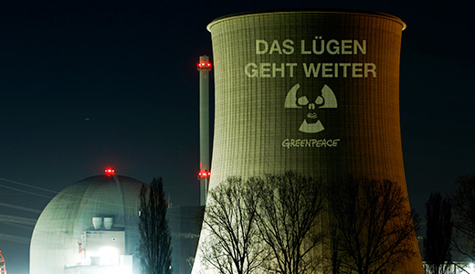 Photo: Activists from the environmental organization Greenpeace put up a banner reading “The lying continues” on one of the cooling towers of the Biblis nuclear power plant in central Germany, early Monday, March 21. (AP/DAPD, Timur Emek)