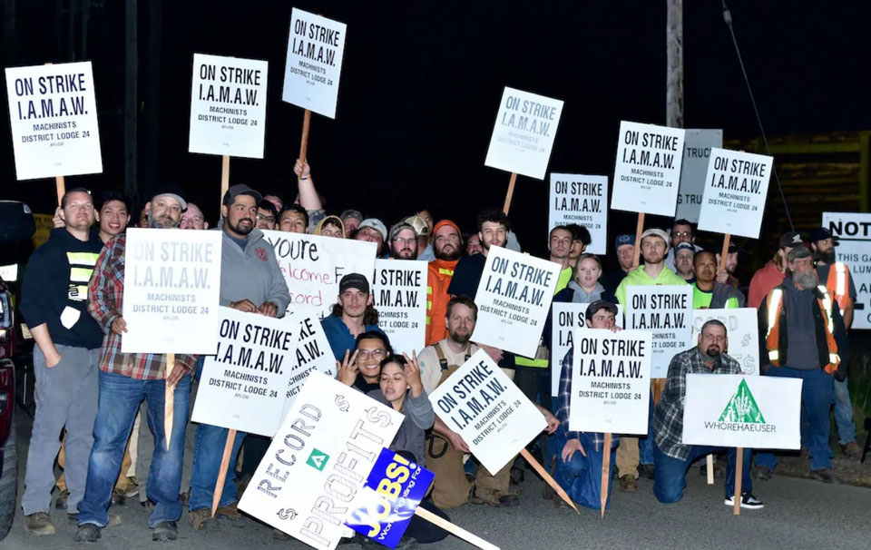 The strike, he added, will push down production of lumber on 2.6 million acres of forest in the Pacific Northwest. “We have struck the thousands and thousands of logging and highway roads our truck drivers drive. We struck because that work is essential to our community’s economy…and it is vitally essential for each and every IAM member who works at Weyerhaeuser to provide for their families and have a secure future.”