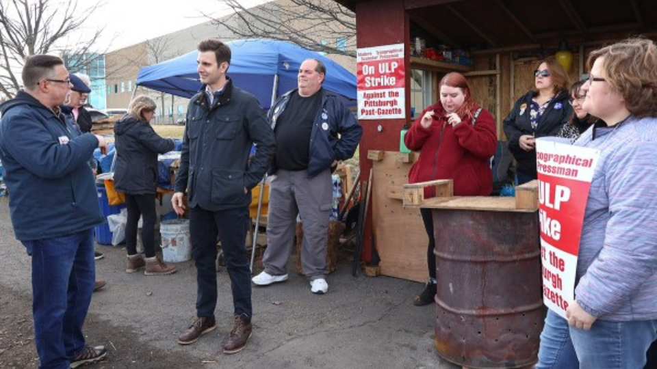 PITTSBURGH—The News Guild’s long-running strike at the Pittsburgh Post-Gazette, prompted by the Block brothers’ plan to slash workers’ health care—and to cut it off after the workers walked—prompted one positive piece of news: Reps. Chris Deluzio, D-Pa., and Sarah McBride, D-Del., reintroduced legislation that, nationwide, would to make yanking or cutting health care from striking or locked out workers an unfair labor practice.