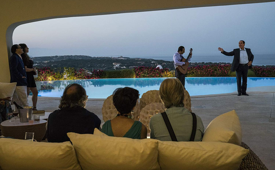 Silvio Berlusconi started out, with a little help from his daddy, as a tycoon in housing development. Ah, Reader, I know you are already thinking “Donald Trump,” and for sure the film draws out a host of parallels between these two paragons of late stage capitalism—the entertainment business, the beauty pageants, the sports teams, the multiple marriages and kids, the corruption, fraud and cheating, the lawsuits, the tacky esthetic taste, the borderline personality, the predatory sex, the uncanny salesmanship of a faux-patriotic populist brand of politics, and the flirtation with fascism. Not to mention the hair.