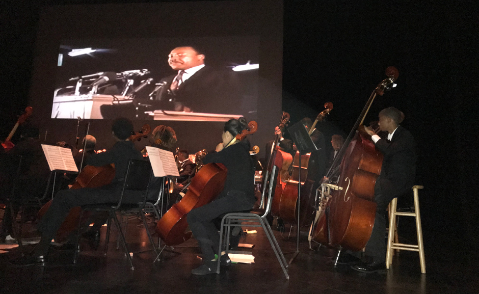 The “pre-concert” was also a concert but of a very special nature. As the audience gathered, from exactly 6:01 pm, the hour at which Dr. King was shot, until exactly 7:05 pm, the hour at which he was pronounced dead, the orchestra played adagio movements from larger symphonic works and short meditative pieces as a kind of somber death watch over the expiring Dr. King. Some of these featured soloists from the orchestra on piano (David Lee), clarinet (Jairus Montgomery), violin (Karah Innis) and oboe (Jessica Wilkins). All the while a spool of historic photos of MLK’s life projected over the stage, as the mostly Black audience members murmured recognition of certain scenes and faces.