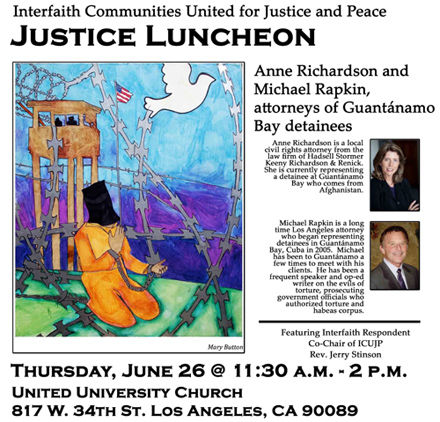 Thursday, June 26 is United Nations International Day of Support for Victims of Torture. At 10:30 a.m. the Stand Together and End Torture Vigil will take place at the corner of Jefferson and Hoover, near the USC campus. At 10:45 a.m. there will be a press conference. At 11:30 a.m. the ICUJP Justice Luncheon will feature the attorneys of two of the Guantánamo Bay detainees, Anne Richardson and Michael Rapkin. The event will take place at the United University Church, 817 W. 34th St., Los Angeles 90089. The suggested donation is $20, but no one will be turned away. Register at http://icujpjustlunch.eventbrite.com.