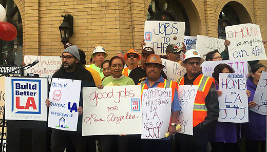 LOS ANGELES – With chants such as “We want Prop JJJ, not Trump’s LA,” and “Angelenos want better jobs,” the Build Better LA Coalition, a coalition of labor and affordable housing advocates, held a rally on Sept. 13th with over 75 participants at the Medici Apartments, owned by luxury apartment developer- and Donald Trump’s number one campaign contributor– Geoff Palmer. In an official statement to the press the coalition said they wanted to send a message that “the future of Los Angeles should not be in the hands of developers like Palmer, who are not furthering the best interests of our communities.” The coalition is calling for “an inclusive solution through Proposition JJJ.”