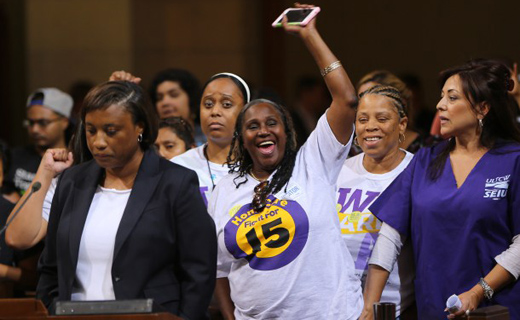 Photo: Workers celebrate the victory of LA’s minimum wage being raised to $15 by 2020. | Damian Dovarganes/AP