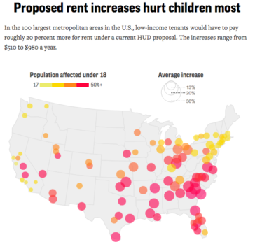 The “Make Affordable Housing Work Act,” announced on April 25, would allow housing authorities to impose work requirements, would increase the percentage of income poor tenants are required to pay from 30 percent to 35 percent, and would raise the minimum rent from $50 to $150 per month. The proposal would eliminate deductions, for medical care and child care, and for each child in a home. Currently, a household can deduct from its gross income $480 per child, significantly lowering rent for families.