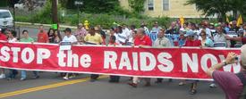 The multiracial crowd from all walks of life gathered at Front Street’s waterfront park. Holding a large red and white “Stop the raids now” banner, Mayor John DeStefano, members of the Board of Aldermen, clergy and John Wilhelm, president of Unite Here’s hospitality division, led the march down Grand Avenue.