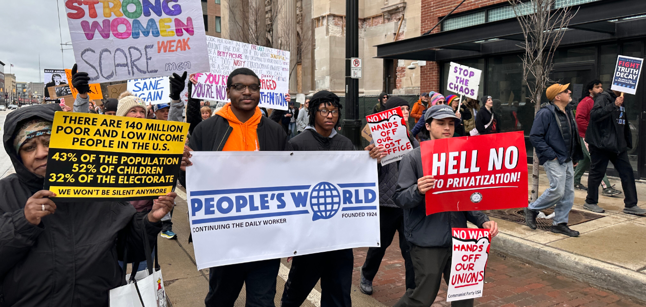 “The obvious drawback of neglecting the issue of peace in Palestine during the ‘Hands Off’ campaign was clear, but activists raised the banner anyway,” Cameron Harrison, of the Communist Party USA’s Labor Commission said. He pointed to the march in Detroit, where “marchers demanded: ‘Hands off Gaza, hands off the Middle East, and hands off Yemen.”