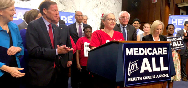 Sanders announced 16 senators are co-sponsors of the legislation. Four named as potential nominees on the 2020 national Democratic ticket—California’s Kamala Harris, Massachusetts’ progressive firebrand Elizabeth Warren, New York’s Kirsten Gillibrand, and New Jersey’s Cory Booker—joined Sanders on the podium to enthusiastically endorse the measure.