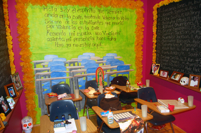 At the museum, one ofrenda on display was dedicated to the memory of 32 Chicago Public School students who died, mostly to gun violence, during the 2006-2007 school year. Students from Big Picture High School in the Back of the Yards community put the display together. They created an empty classroom with a symbolic seat for each of the departed youth leaving behind school bags, books, soft drinks and bags of potato chips. Two chalkboards list names and ages of those who died.
