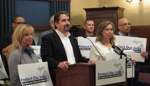 Those speaking at the press conference said the initiative is a response to the legislature’s attack on Michigan’s middle class, from the taxing of seniors’ pensions and cutting funds for education (while at the same time lowering taxes on corporations) to the 80 plus bills in the legislature that dismantle the workers’ compensation system, prohibit school systems from deducting union dues or service fees, force the privatization of non-instructional school workers in public schools, eliminate prevailing wage requirements and remove the current requirement of employers to notify striking unions when they are hiring replacement workers.