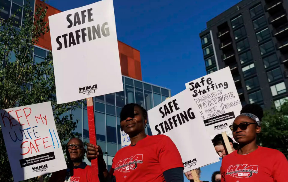 MINNEAPOLIS–Union nurses from the Minnesota Nurses Association and 15 hospitals from the Twin Cities and Duluth held an informational picket line in front of Hennepin Healthcare on Monday after they overwhelmingly voted on August 15 to authorize a strike.