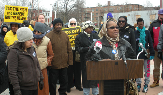 ST. LOUIS – “We cannot cut our way to job creation,” the Rev. Roosevelt Broadnax told labor and community allies here as they held a press conference out-side of the Delmar-Loop Social Security office on December 10.