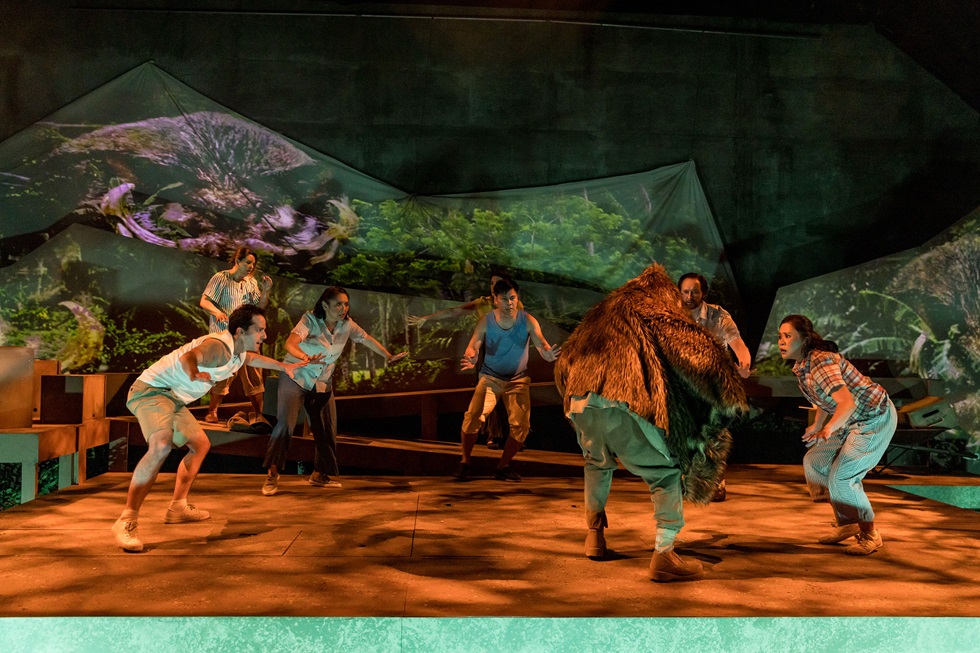 Some of the key moments of the fast-moving play are choreographed—the hike up the mountain, capturing a wild boar, and a funeral. These are among the most electric episodes in the drama. The physical response to air raids and bombing sorties is nothing short of visceral. Somehow in the wild the refugees cleverly find places to wash themselves and their clothes.
