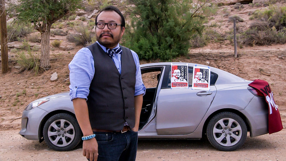 So Moroni for President is a breath of fresh air because it shines a light on America’s Indigenous people with an insider’s view (and no ads!). But this doc is also worth seeing because its eponymous real-life subject is a unique individual. The youthful, bearded Moroni Benally attended Stanford, became a university professor at a college in Washington State, and visually stands out in a crowd of candidates because he is the only Navajo presidential aspirant who, like Senator Paul Simon, wears a bowtie (cowboy hats and wrangler jeans are more de rigueur among the tribal contenders).