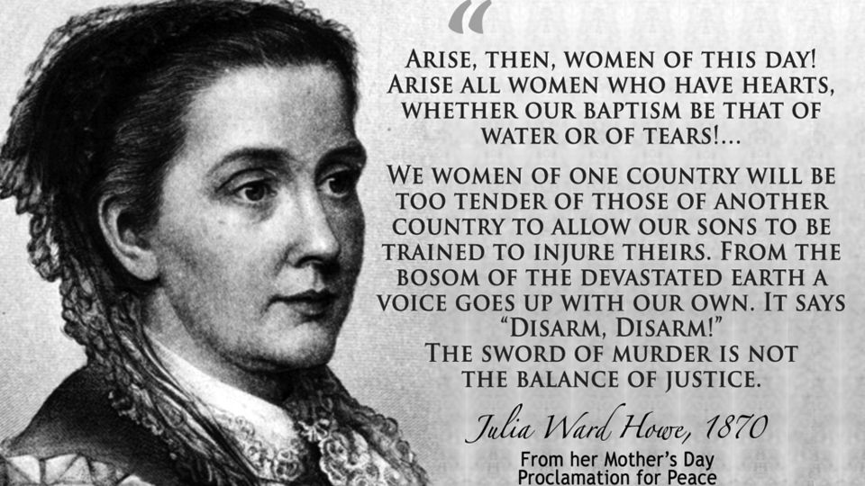 “As men have forsaken the plow and the anvil at the summons of war, let women now leave all that may be left of home for a great and earnest day of counsel. Let them meet first as women, to bewail and commemorate the dead. Let them solemnly take counsel with each other as to the means whereby the great human family can live in peace, each bearing after his time the sacred impress not of Caesar, but of God.