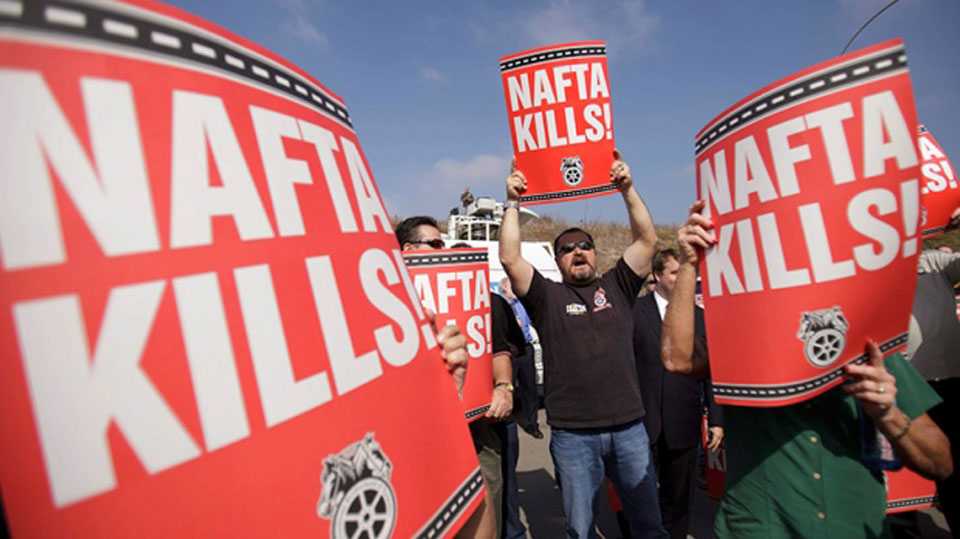 The North American Free Trade Agreement – NAFTA – was signed by President George H. Bush in 1992 and pushed through Congress by President Bill Clinton in 1993. Its advocates – big corporations, Republicans, and neoliberal Democrats – claimed that by eliminating tariffs and any restraints on the flow of capital, the U.S. trade balance would improve. They claimed that NAFTA would reduce immigration from Mexico by improving environmental conditions and raising the wages there.