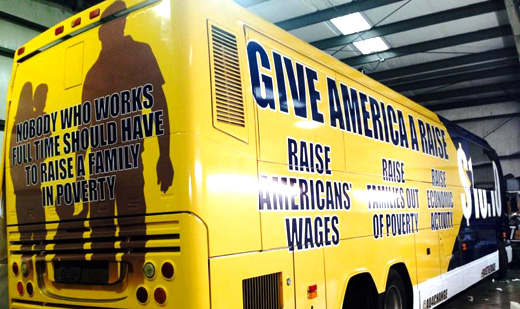 Photo: The raise the wage bus gets ready for its nationwide tour on the way to Washington, D.C., part of one of two big nationwide bus campaigns unionists are heavily involved in, leading to marches in D.C. in early April. The other campaign is for immigration reform. Photo courtesy Americans United for Change via PAI Photo Service.