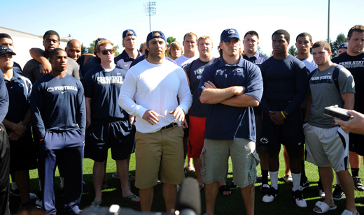 Photo: Penn State senior running back Michael Zordich, left foreground, and senior linebacker Michael Mauti, right foreground, give a statement in support of their team, as other players look on, July 25, in State College, Pa. Nabil K. Mark/The Centre Daily Times/AP