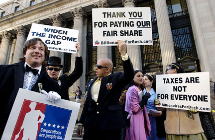 Photo: “Billionaires” thank the 99 percent of New Yorkers for paying taxes – so billionaires won’t have to (Fred Askew/billionairesforbush).