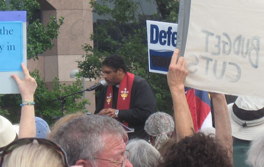 Photo: N.C. NAACP President the Rev. William Barber speaks at the podium during the eight Moral Monday protest in Raleigh (PW/Harvey Smith).