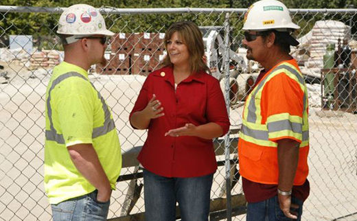 Photo: Shelli VanDenburgh talks with construction workers. Shelli VanDenburgh official Facebook page