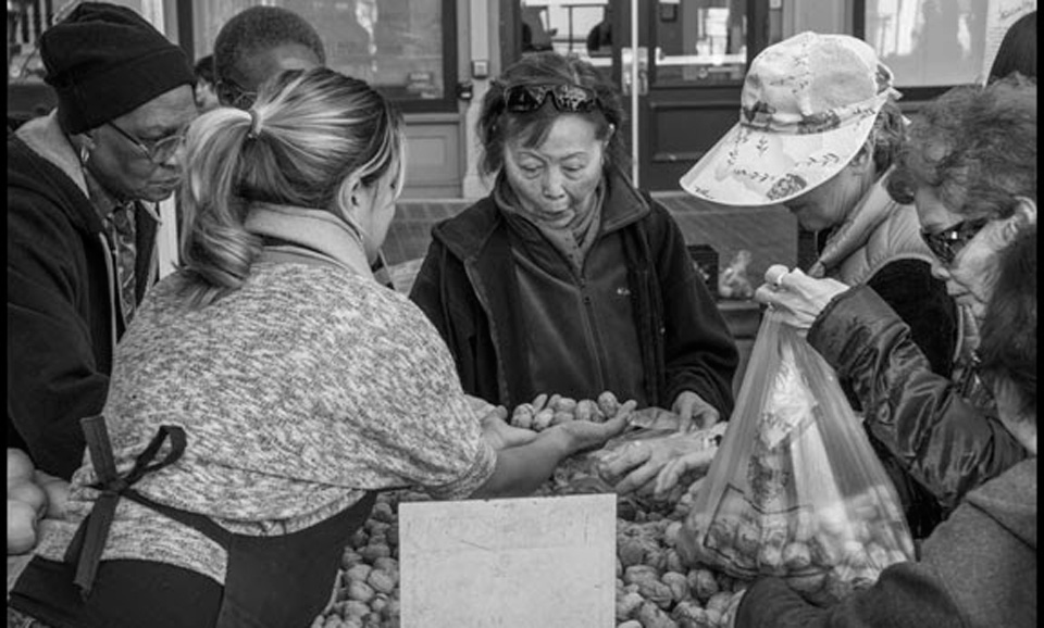 At the Friday farmers’ market in Oakland, California, I can see those mothers in front of the stalls, bargaining over the produce. Oakland is a working-class city across the bay from San Francisco, and like many California cities, it has an historic Chinese and Asian American community–a Chinatown. Being right next to Chinatown makes the Oakland farmers’ market unique.