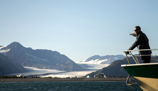 Photo: President Barack Obama looks at Bear Glacier, which has receded 1.8 miles in approximately 100 years, while on a boat tour to see the effects of global warming in Resurrection Cove, Sept. 1, in Seward, Alaska. Obama is on a historic three-day trip to Alaska using its glorious but changing landscape as an urgent call to action on climate change. (AP Photo/Andrew Harnik)