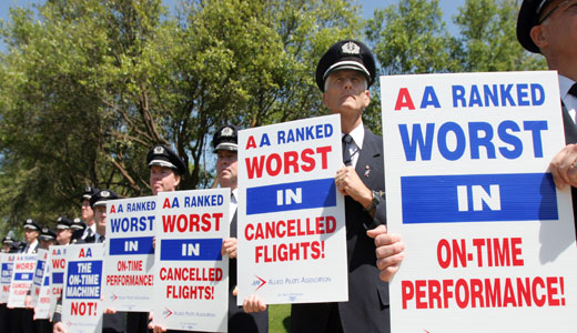 Photo: Airline pilots at a demonstration against American Airlines four years ago warned that cutbacks endangered passenger safety. Now the airline wants to get rid of pensions and lay off even more workers. D.J. Peters/AP Photos