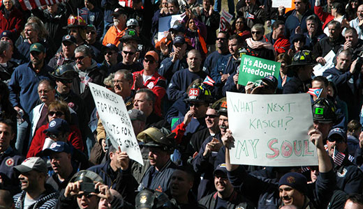 Rev. Tim Ahrens, from the First Congregational Church in Columbus, was speaking to the rally as Kasich’s rambling speech began to come over the outdoor speakers. The governor’s words were greeted by thundering chants of “Recall, recall,” and “Kill the bill,” drowning out the speech. Finally, to the pleasure of the crowd, the huge speakers were cut off and Rev. Ahrens resumed his own remarks.