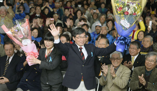 Photo: Nago City Mayor Susumu Inamine, center right, and his wife Ritsuko celebrate his re-election, Jan. 19, 2014. AP/Kyodo News
